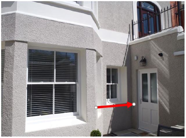 2. Through the front door of the main building and through the hallway and out at the rear. (red arrows) You will need to use the gold yale key to access the main building. You will need the security key to open the back yard gate.